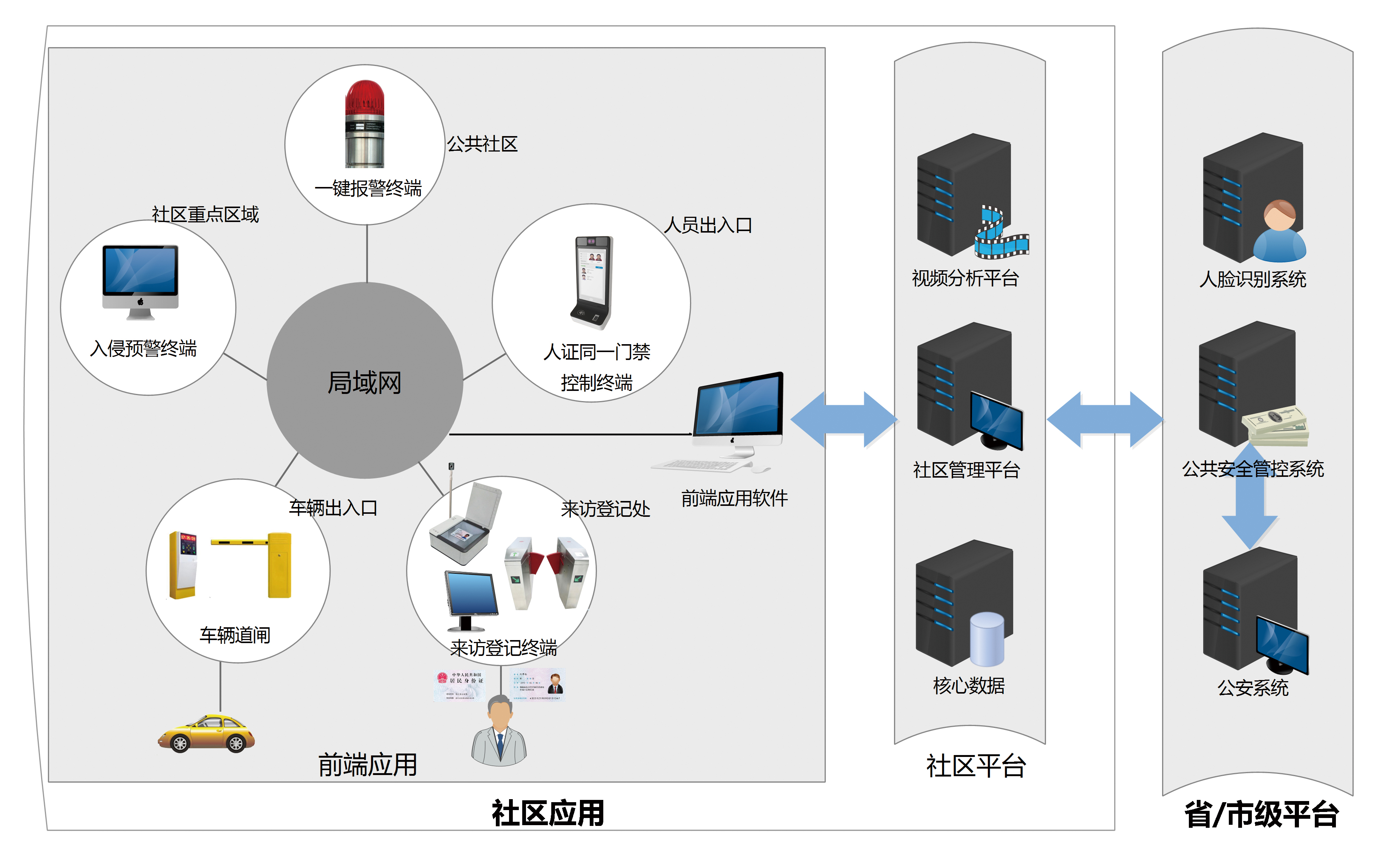 各类身份信息采集终端+园区管理平台+省市级管理平台。身份信息采集终端包括:证卡识读终端(含人像、指纹采集)、车牌车型识别终端、访客登记设备、门禁控制设备;管理平台包含人员信息采集、人证同一认证、联网核查、车牌识别、自动通关、门禁控制、入侵预警、一键报警等管理子系统。