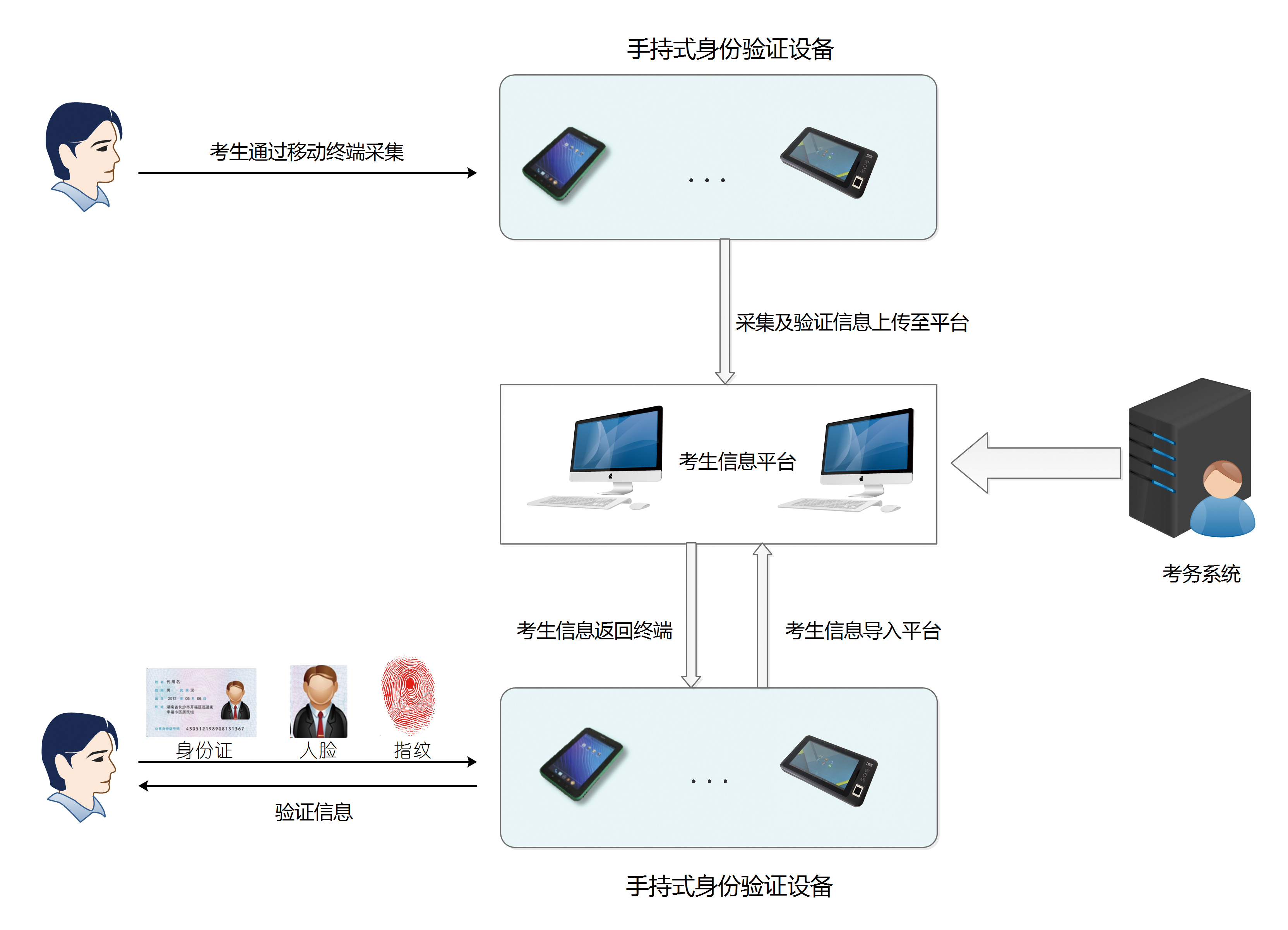 信息采集:采集端设备采集考生身份证信息、照片、指纹等身份信息,考生信息建库。